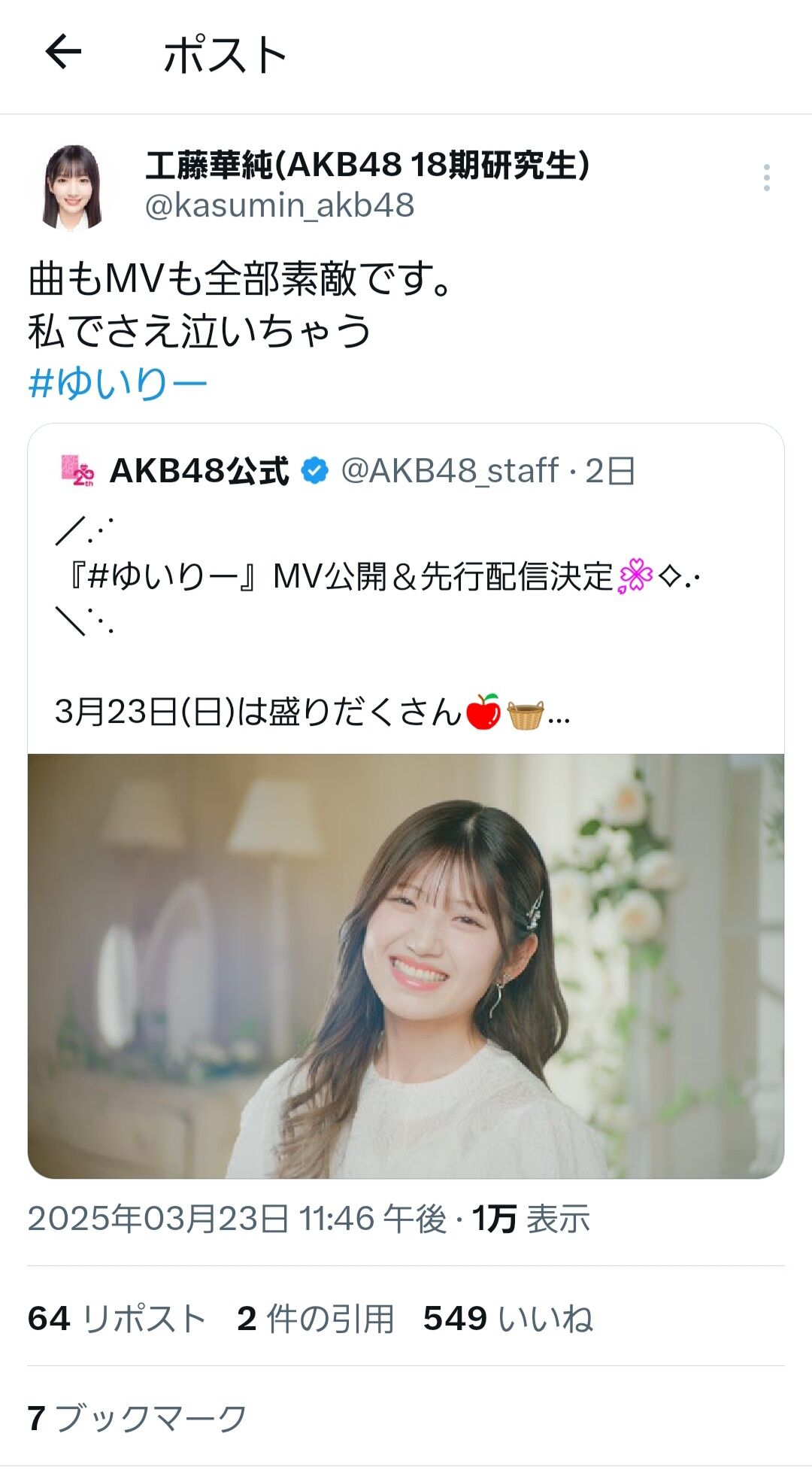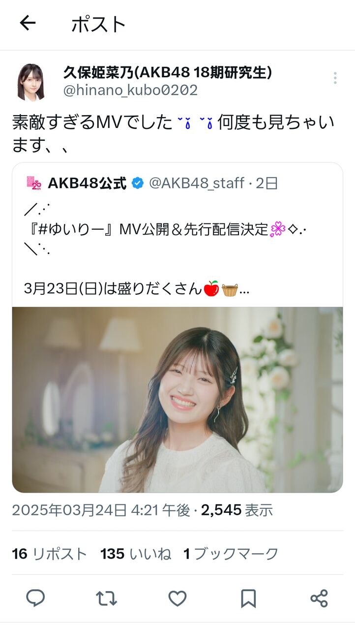 そして今回、AKB48 20周年イヤー第1弾となる65枚目シングル「まさかのConfession」でセンターをに選んでいただきました。