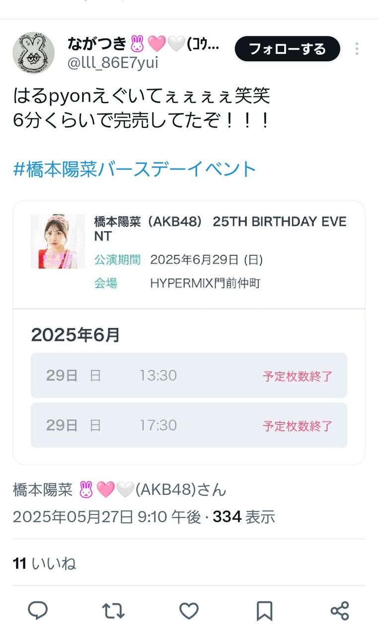 【朗報】橋本陽菜さんのバースデーイベントが速攻で完売する!