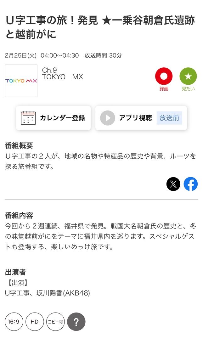 本日2月20日(木)とちぎテレビ放送の「U字工事の旅発見」一乗谷朝倉氏遺跡と越前がに~福井県~に出演させていただきます🥲✨
